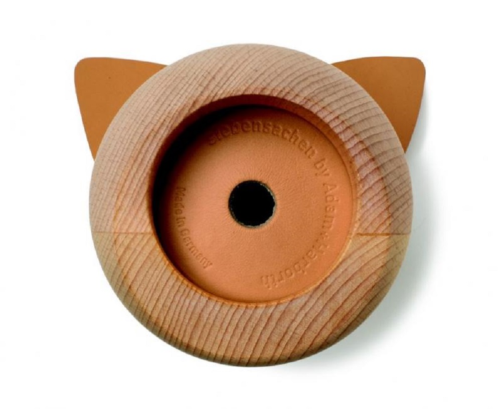 13 x 11 x 17 cm; massives Buchenholz aus regionaler Forstwirtschaft, gewachst; Augen in Intarsientechnik aus Akazienholz; Ohren und Verschluss aus Kernleder hell oder dunkel gegerbt; hergestellt im Schwarzwald; in Geschenkkarton.
