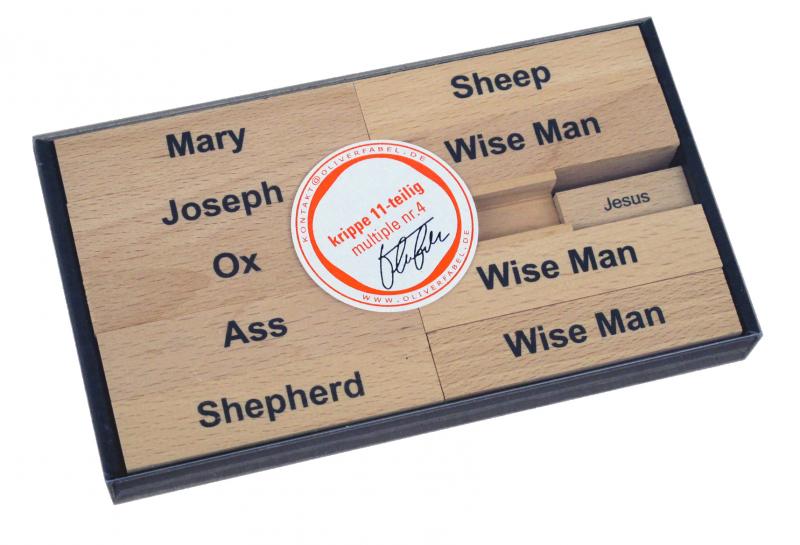 die krippe 11-teilig besteht aus unbehandeltem buchenholz und wird in handarbeit gestempelt. sie enthält ein signiertes zertifikat sowie eine anleitung auf der rückseite der schiebeschachtel.