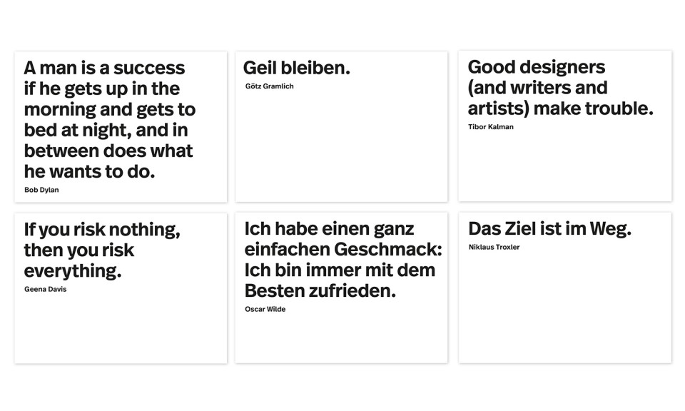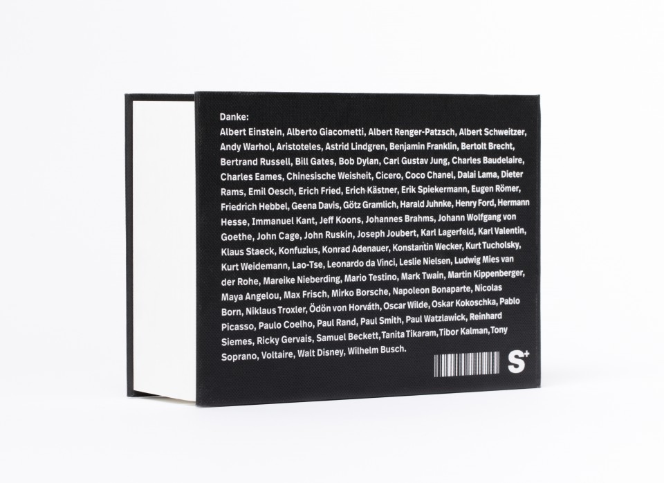 Aus einer persönlichen Leidenschaft für Zitate hat der bekannte Berliner Grafik-Designer Boris Brumnjak (†) seine 100 inspirierendsten Zitate zusammengetragen. Die Zitate stammen von weltweit bekannten Kreativ-Legenden wie Andy Warhol, Winston Churchill, Bertolt Brecht, Kanye West, Mario Testino, Karl Lagerfeld und vielen anderen. Die besondere Sammlung präsentiert sich in einem einhundert Postkarten umfassenden und hochwertig verarbeitetem Hardcover-Postkartenbuch. Jede einzelne Karte kann aus dem Block herausgetrennt werden.